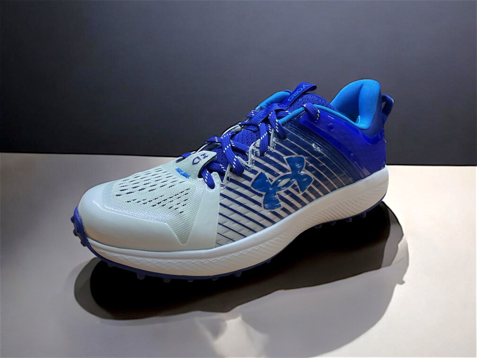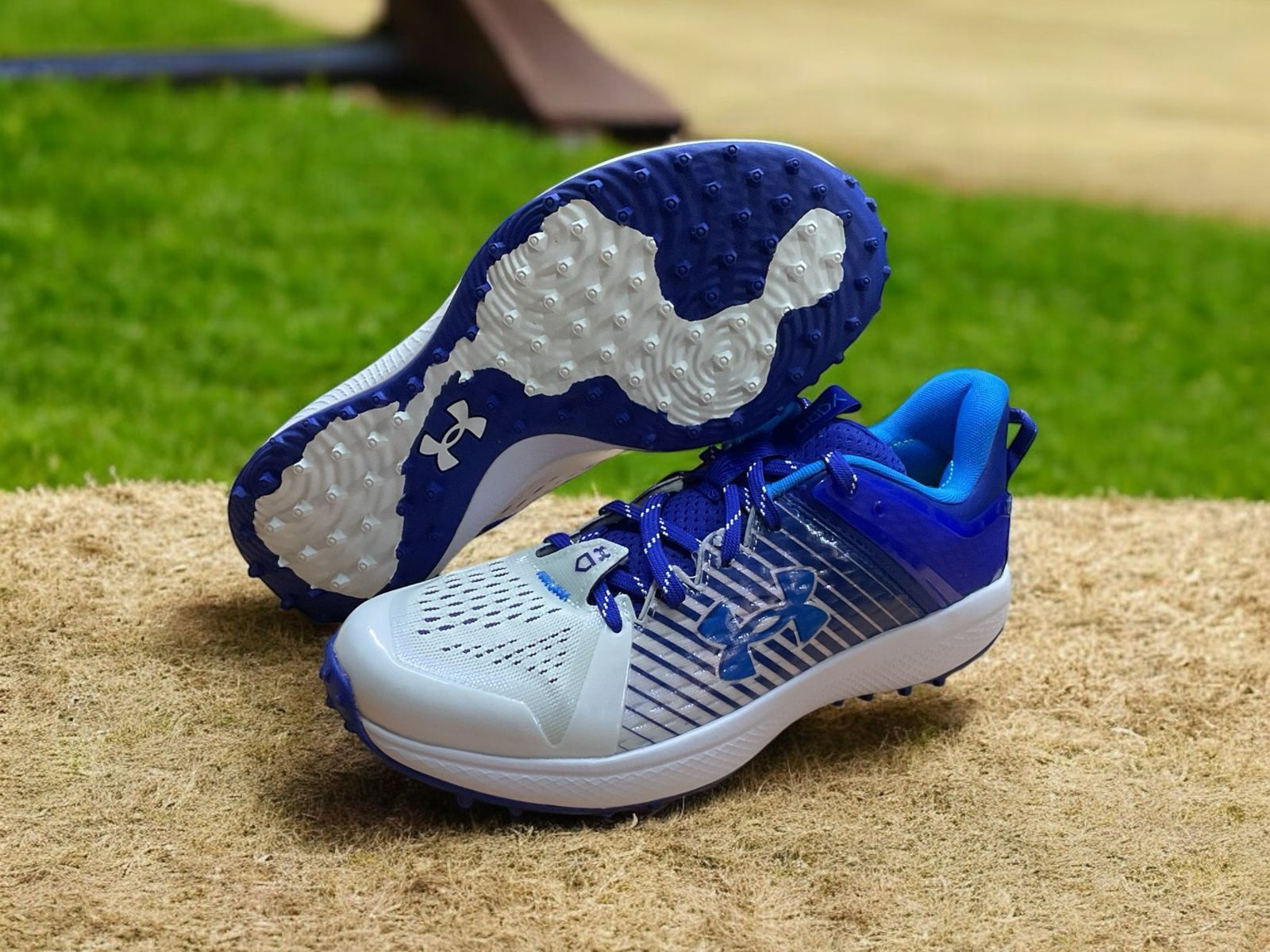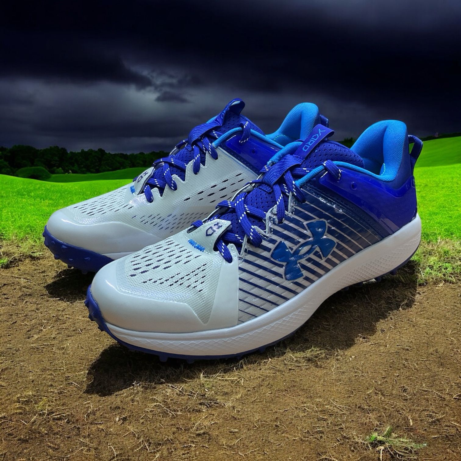 Los Under Armour Yard Turf en blanco y azul marino son tenis diseñados para jugadores de béisbol que necesitan versatilidad y rendimiento en diferentes superficies. Incorporan la tecnología de amortiguación UA HOVR™, que proporciona un retorno de energía eficiente y comodidad durante movimientos explosivos. Su parte superior "UA Clone" se adapta al pie para un ajuste personalizado, mientras que la suela de goma no deja marcas y ofrece tracción ligera en diversas superficies. Estos tenis permiten transiciones fluidas entre el gimnasio, las jaulas de bateo y el campo, brindando soporte y confort en cada paso.