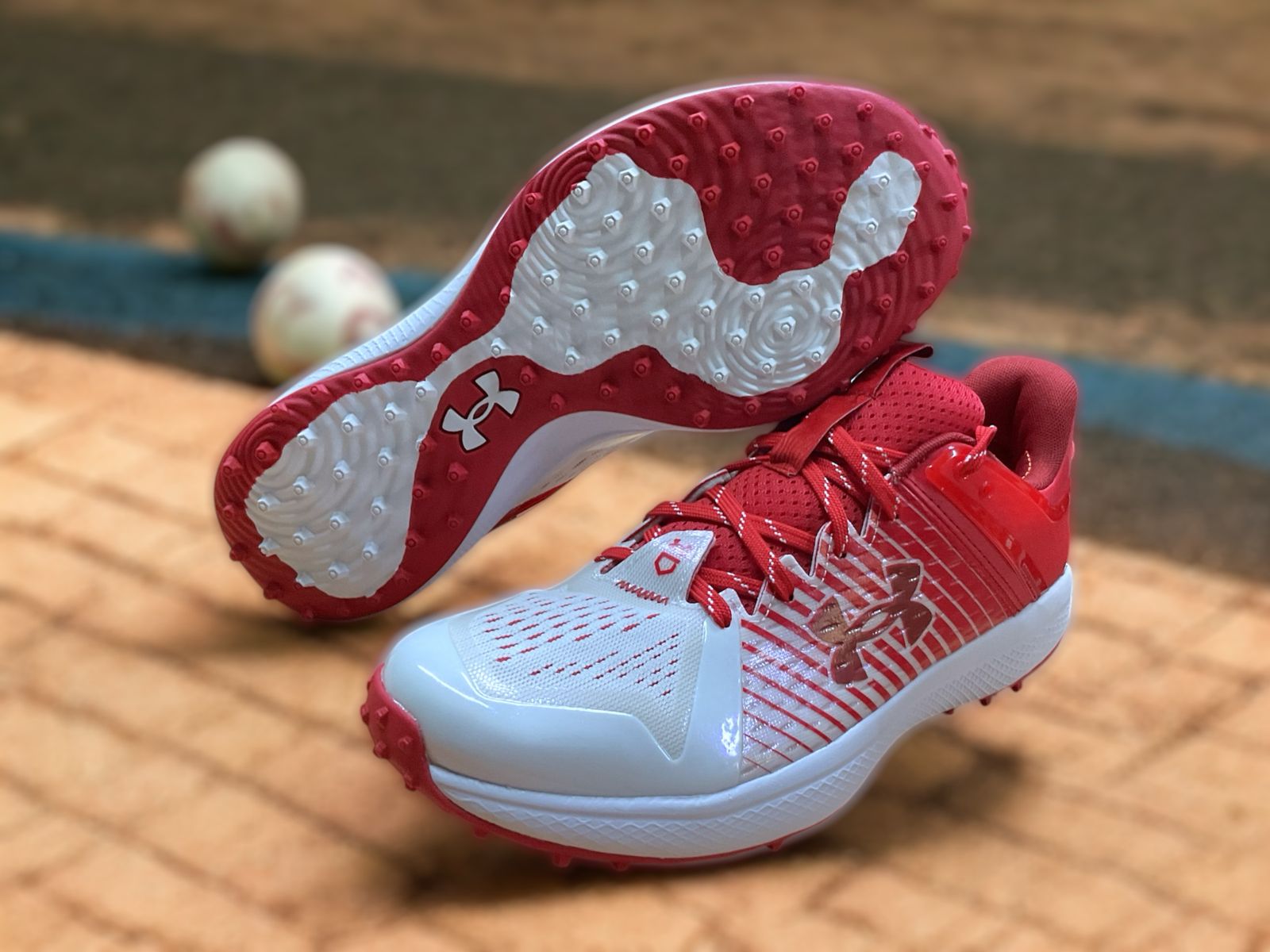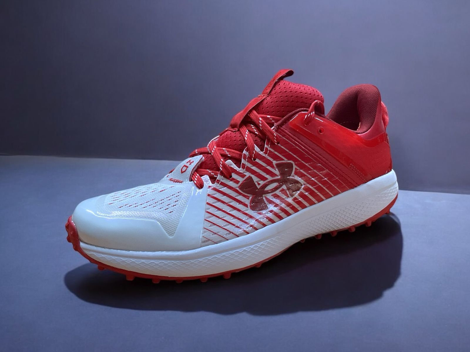 Los Under Armour Yard Turf en color rojo con blanco están diseñados para jugadores de béisbol que buscan rendimiento y comodidad en superficies de césped sintético. Incorporan una amortiguación Charged Cushioning® que absorbe el impacto y lo convierte en energía explosiva, ideal para movimientos rápidos y potentes en el campo.